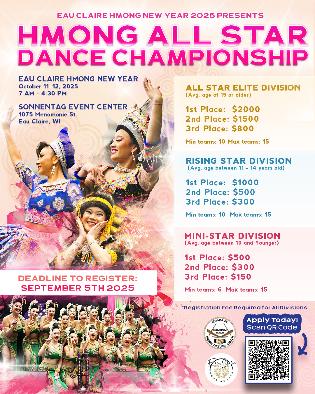 This year, the Eau Claire Hmong New Year Committee is proud to host the Hmong All Star Dance Championship—and registration is officially open. We’re inviting dance teams from near and far to compete, connect, and celebrate our vibrant culture through movement and performance.